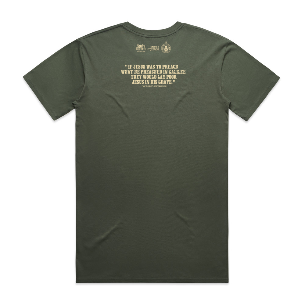 This commemorative WGP 2025 Shirt features a U2 dual-color design on the front and a U2 selected Woody Guthrie quote on the back.